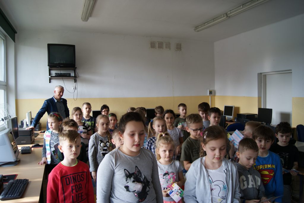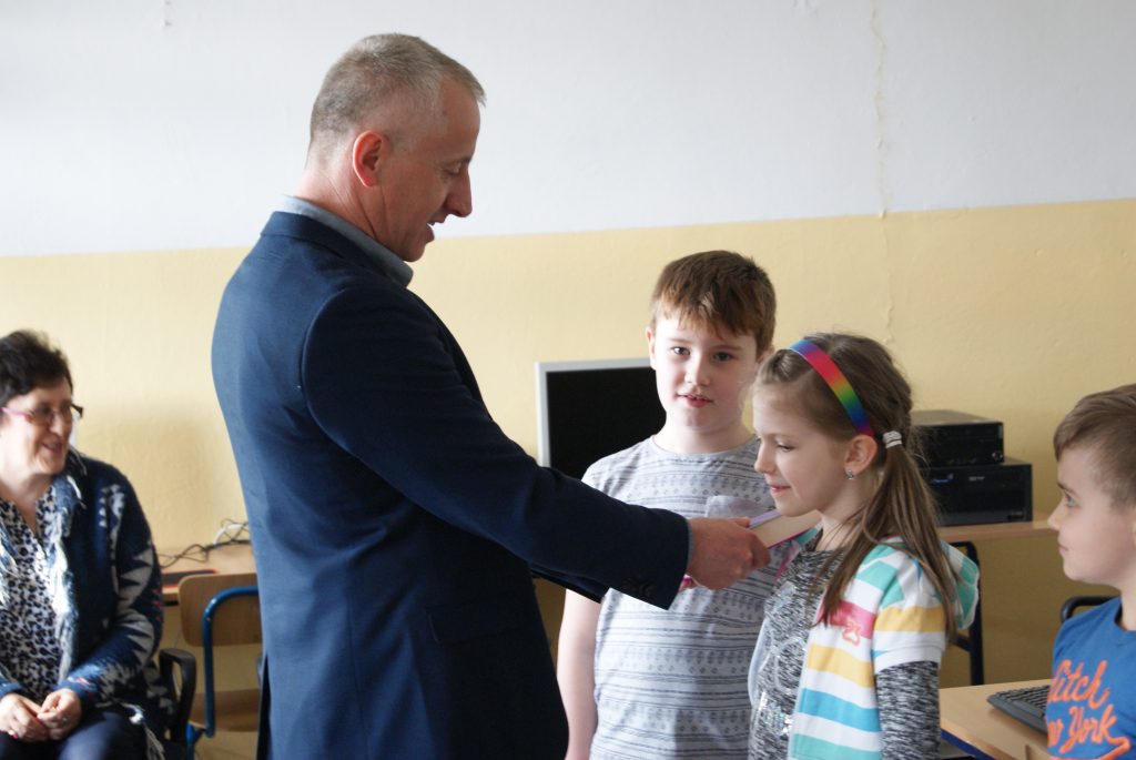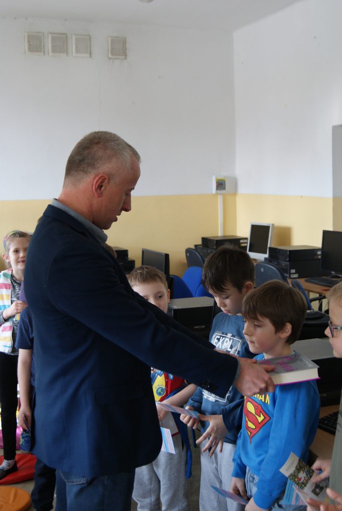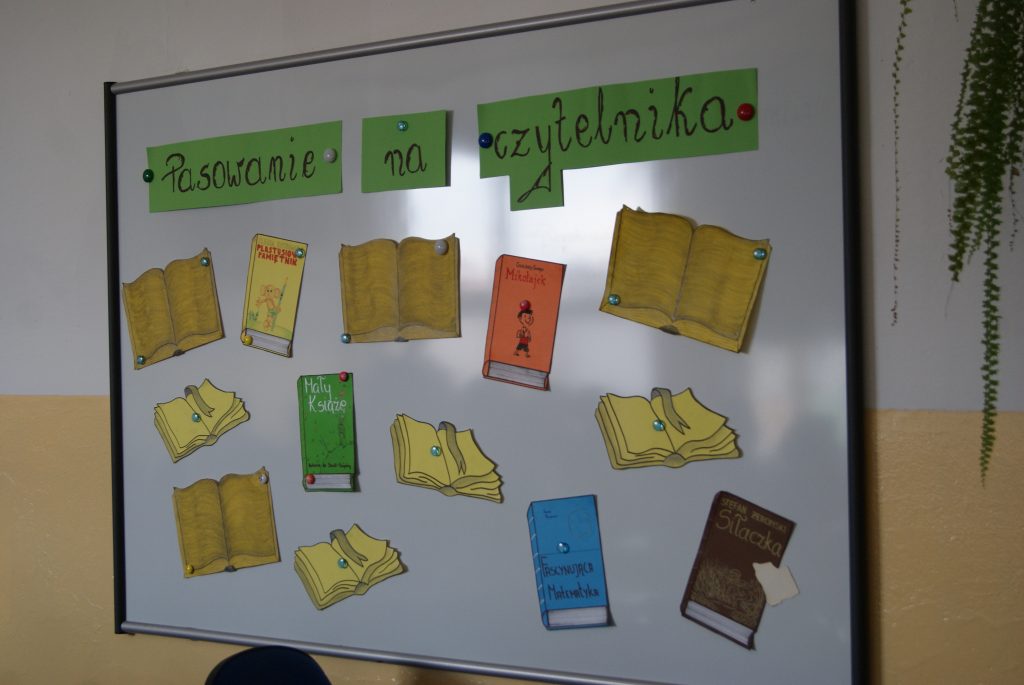 Po takim wprowadzeniu przyszli czytelnicy złożyli uroczyste ślubowanie, że zawsze będą szanować książki, a Pan Dyrektor Robert Hryszko dokonał pasowania każdego z uczniów. Na pamiątkę tego wydarzenia nasi pierwszoklasiści otrzymali zakładki oraz specjalnie na tę okazję wykonane „prośby książki”.