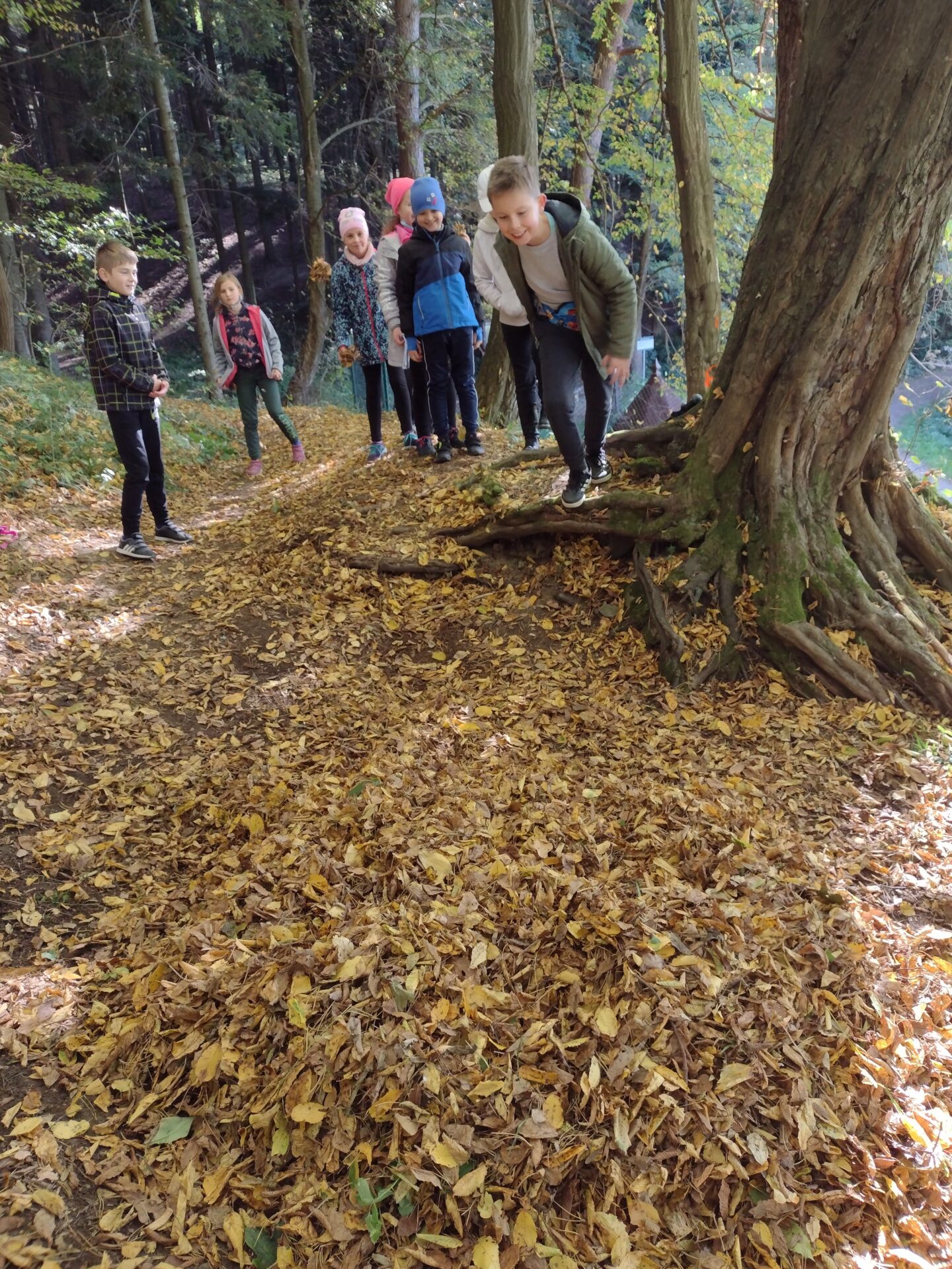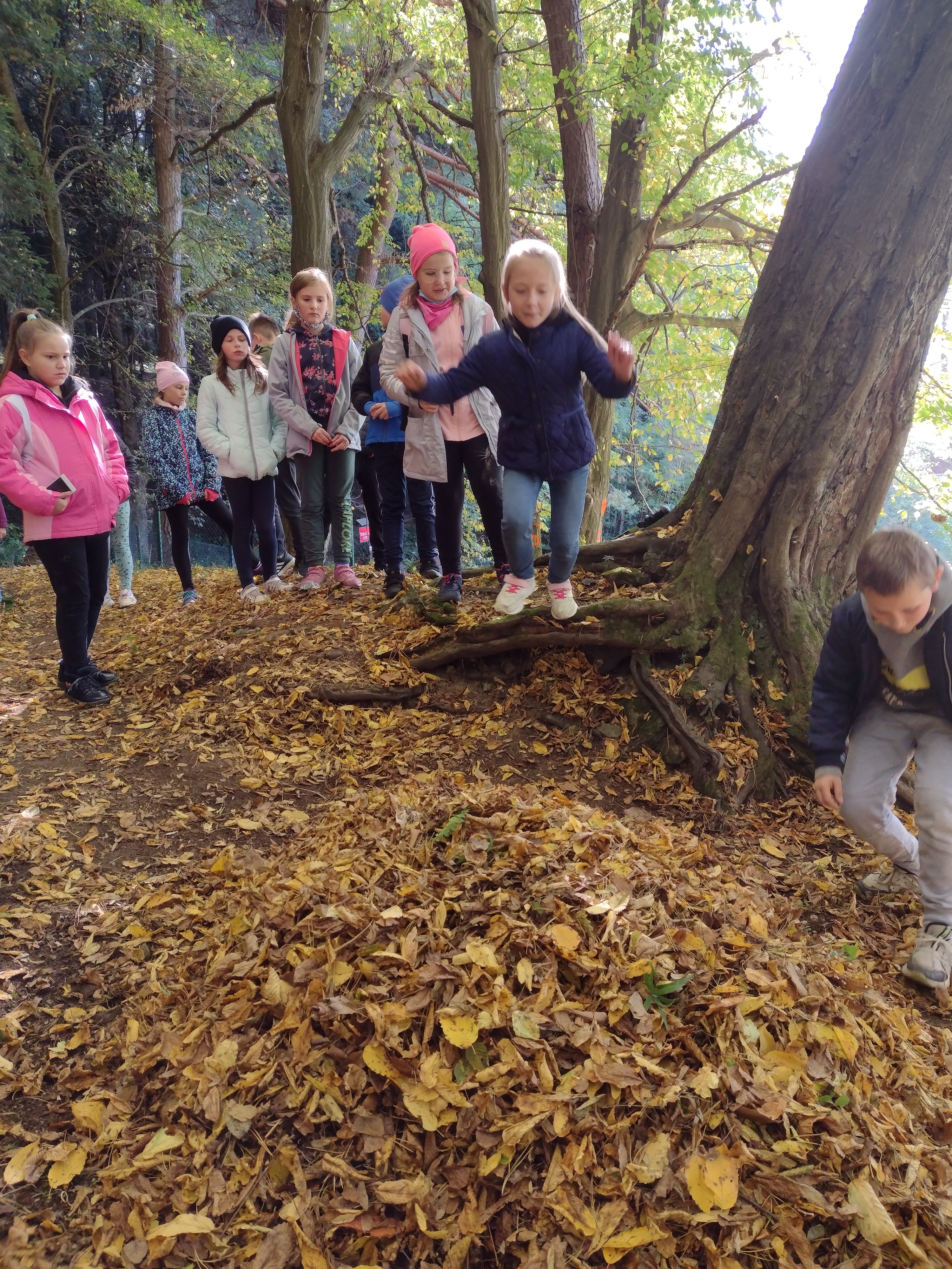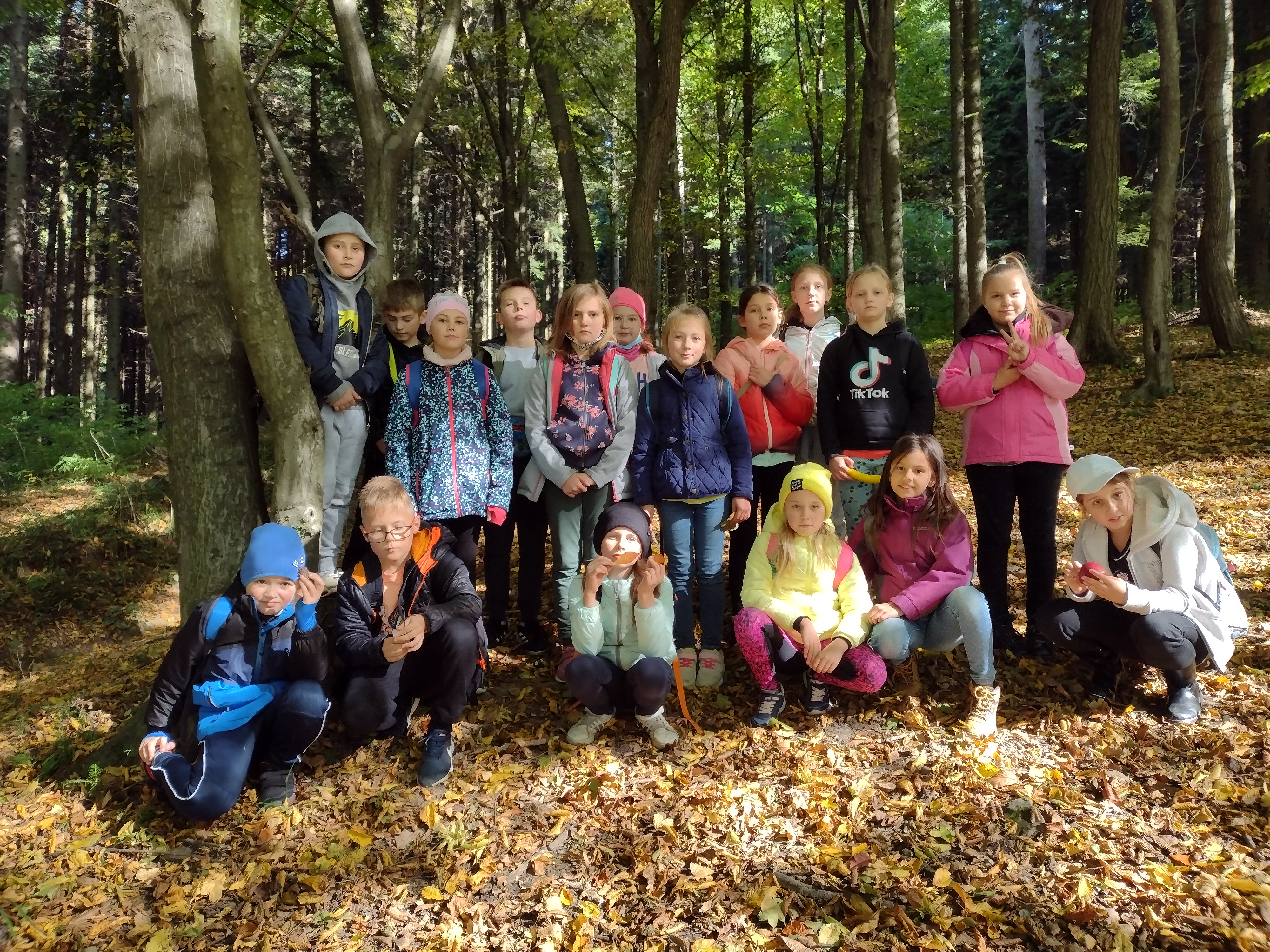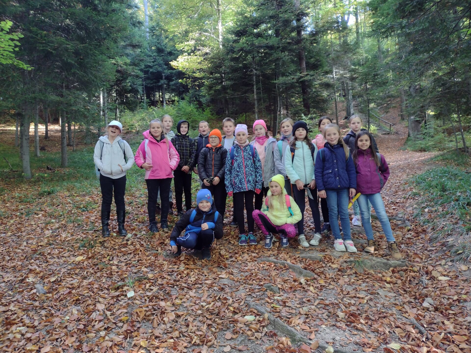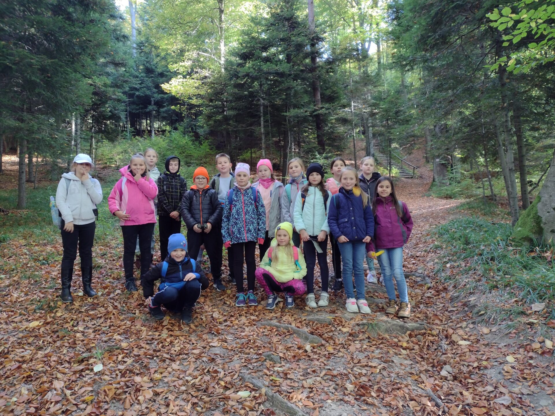 Klasa 3b w dniu 8 października udała się na wycieczkę rekreacyjno-edukacyjną do lasu w Sanoku, będącego częścią Parku Krajobrazowego Gór Słonnych. Celem wycieczki było przypomnienie dzieciom, z jakich warstw jest zbudowany las, rodzaje lasów występujących w środowisku, a także jakie zwierzęta i rośliny możemy spotkać w tym miejscu. Podczas spaceru po lesie uczniowie starali się rozpoznać typowe dla tego miejsca rośliny oraz nazwać różne gatunki drzew, a także ich owoce. Korzystając z lup oraz lornetki mogli obserwować leśne ptaki, owady oraz budowę roślin czy też wygląd mrowiska. Wycieczka przebiegła w miłej atmosferze, to był piękny, jesienny dzień. Nasi wychowankowie cieszyli się ze wspólnie spędzonych chwil, uczestniczyli w grach i zabawach integrujących grupę, zjedli wspólnie drugie śniadanie. Podczas spacerowania zebrali liście oraz inne dary przyrody, które wykorzystano w szkole podczas lekcji edukacji przyrodniczej.