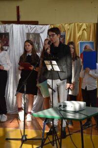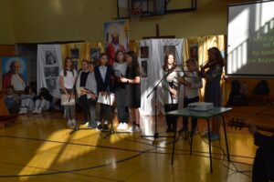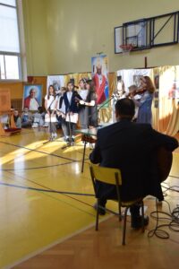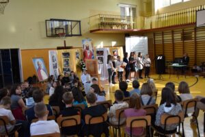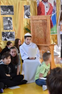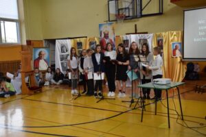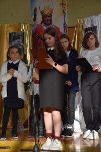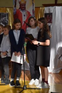 Uczniowie klasy 5a podjęli trud przygotowania akademii poświęconej postaci św. Jana Pawła II. Wydarzeniu nadaliśmy tytuł: „Ocalić od zapomnienia”. I dnia 24 października kolejny raz mieliśmy okazję, aby poznać tak wielkiego człowieka, prześledzić koleje Jego życia i podziękować za piękny dar papieskiej posługi. Dzieci wykazały się wielkim zaangażowaniem w przygotowaniu akademii oraz kilku piosenek. Piękne dekoracja przygotowała Pani Krystyna Szwan, a nad całością czuwał ks. Jacek.