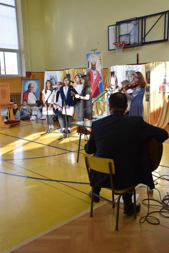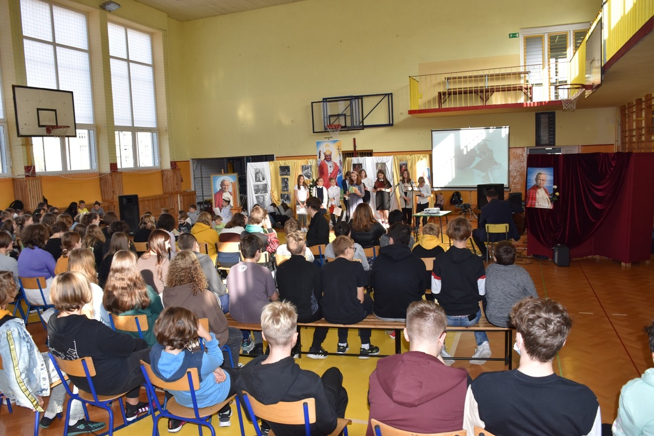 Uczniowie klasy 5a podjęli trud przygotowania akademii poświęconej postaci św. Jana Pawła II. Wydarzeniu nadaliśmy tytuł: „Ocalić od zapomnienia”. I dnia 24 października kolejny raz mieliśmy okazję, aby poznać tak wielkiego człowieka, prześledzić koleje Jego życia i podziękować za piękny dar papieskiej posługi. Dzieci wykazały się wielkim zaangażowaniem w przygotowaniu akademii oraz kilku piosenek. Piękne dekoracja przygotowała Pani Krystyna Szwan, a nad całością czuwał ks. Jacek.