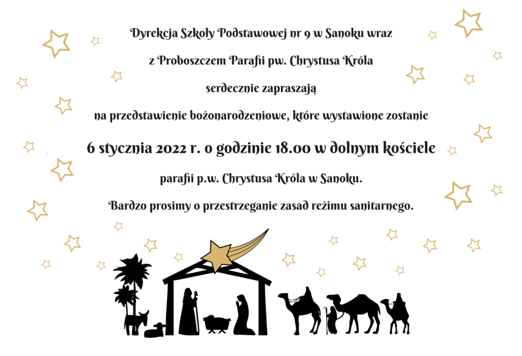Aktualności Zaproszenie na przedstawienie bożonarodzeniowe Przez SP9 - 5 stycznia 2022 0 1211 Podziel się na Facebooku Tweet (Ćwierkaj) na Twitterze Serdecznie zapraszamy wszystkich zainteresowanych na przedstawienie bożonarodzeniowe w którym głównymi aktorami, będą uczniowie naszej szkoły. Szczegółowe informacje na poniższej grafice.