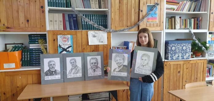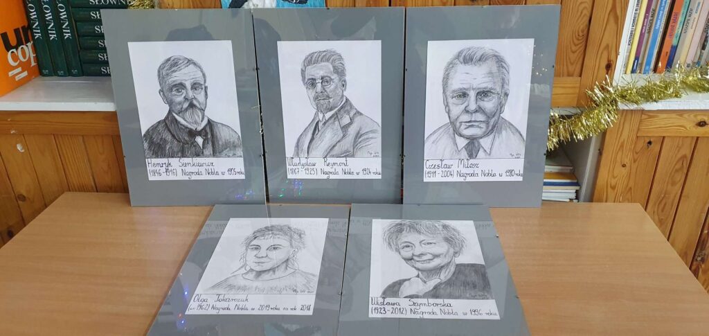 Aby propagować wśród uczniów wiedzę o polskich laureatach literackiej Nagrody Nobla i upiększyć otoczenie sali j. polskiego, Maja wykonała portrety polskich pisarzy i poetów odznaczonych tą prestiżową nagrodą. Z chęcią i zaangażowaniem przystąpiła do pracy. Poświęciła jej wiele godzin swojego wolnego czasu, a efekty są wspaniałe, zresztą – oceńcie sami. Bardzo dziękujemy Mai! Mamy nadzieję, że przechodząc korytarzem, zatrzymacie się przy jej pracach i utrwalicie wiedzę o polskich noblistach w dziedzinie literatury.