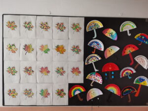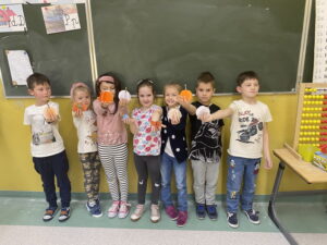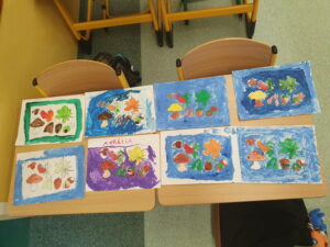 Obserwując panującą na zewnątrz aurę, omawialiśmy charakterystyczne cechy jesieni, opowiadaliśmy o wykonywanych pracach w ogrodzie, darach jesieni, jakie grzyby są jadalne, a które niejadalne. Czytaliśmy wiersze o jesieni i grzybach m.in. „Grzyby” J. Tuwima. Nie mogło również zabraknąć piosenek o tematyce jesiennej. Śpiewaliśmy i słuchaliśmy m.in. „Idzie jesień”, „Jesienny deszcz”, „Zbieramy grzyby”.
