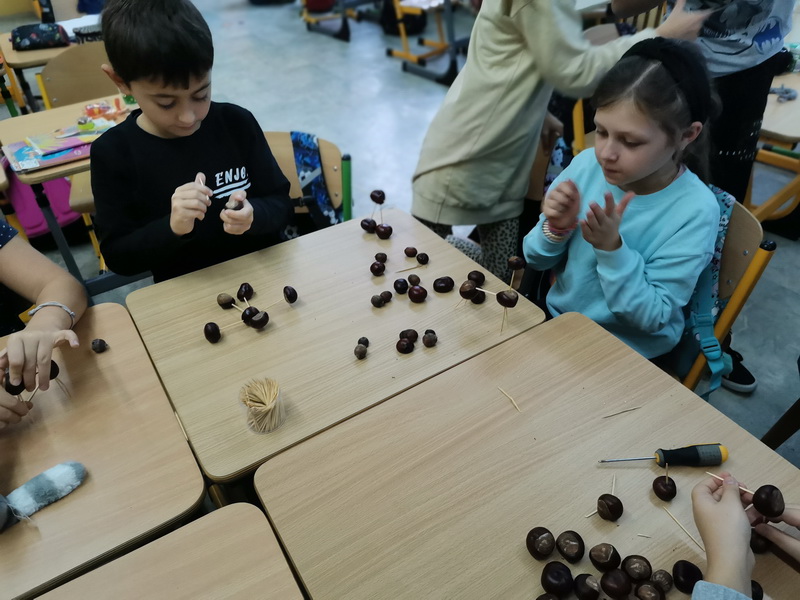 W naszej świetlicy znów gwarno i wesoło, a złota jesień coraz bardziej ukazuje swoje oblicze. Podczas zajęć inspirowaliśmy się pięknymi darami jesieni. Powstawały korale i bransoletki z uzbieranej jarzębiny, ludziki, zwierzaki i różnego rodzaju konstrukcje z przyniesionych z parku kasztanów. Nasion klonowych użyliśmy do zrobienia pięknych ważek. Liście jesienne również zostały wykorzystane do wielobarwnych odbitek. Ponadto wykorzystując rozmaite techniki, uczniowie wykonali jesienne liście, jeże, parasolki i wiele innych przedmiotów. Wszystkie prace można podziwiać na naszych świetlicowych gazetkach.