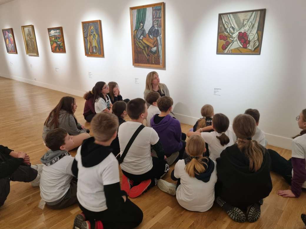 Dla zdecydowanej większości uczniów była to pierwsza wizyta w Muzeum Narodowym i możliwość przyjrzenia się z bliska oryginalnym, wybitnym dziełom polskich malarzy i rzeźbiarzy. Piątoklasiści uczestniczyli w niezwykle ciekawej lekcji pt. „Czy woda jest niebieska, a jabłko okrągłe? O kolorach i kształtach w sztuce”. Pojęcia kluczowe związane z lekcją to: sztuka abstrakcyjna, sztuka figuratywna, kolor, kolory zimne i ciepłe, podstawowe i pochodne, koło barw, kształt, figura, geometria, kompozycja, proporcje, rytm, wyobraźnia.