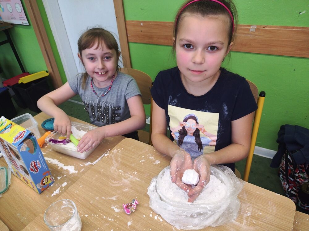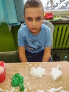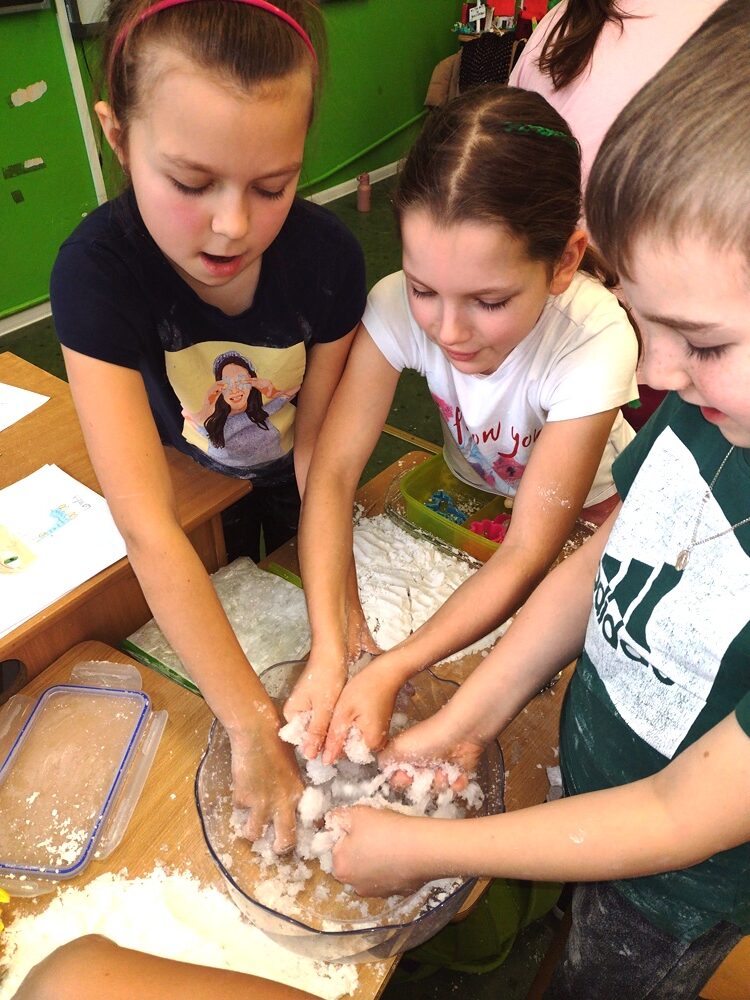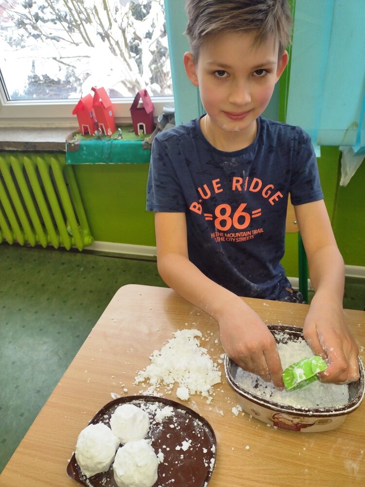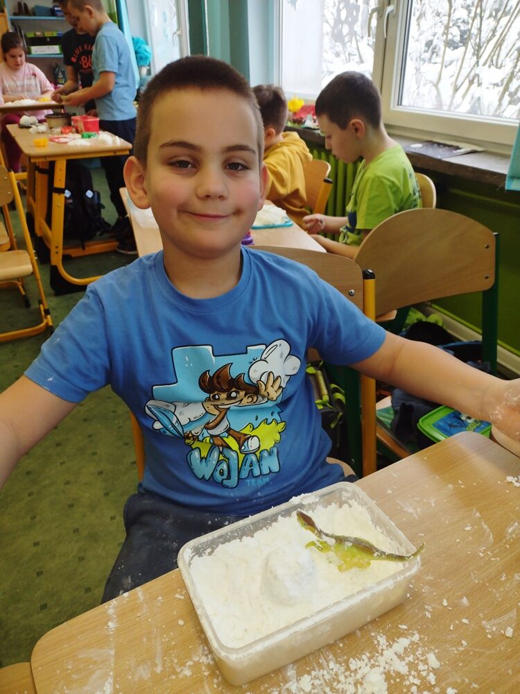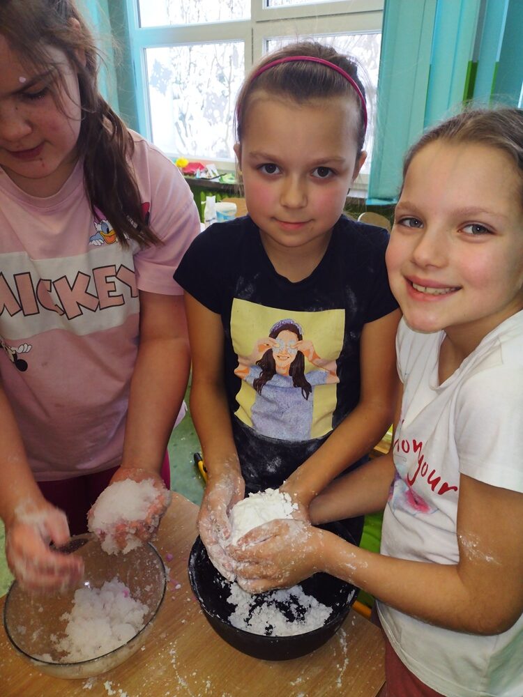 Uczniowie klasy 3a w ramach zajęć z edukacji plastycznej mieli okazję stworzyć sensoryczne masy plastyczne, takie jak „ciepły śnieg”, „piankolina’, a także sprawdzić właściwości „cieczy nieniutonowskiej” oraz hydrożelu, który po dodaniu do niego wody wyglądem przypomina mokry śnieg. W tym celu na lekcji wykorzystano takie składniki, jak mąka ziemniaczana, olej, barwniki spożywcze, pianka do golenia oraz hydrożel ogrodniczy. Tematem przewodnim zajęć była obecna „zima”, a ciepły śnieg pozwolił na zbudowanie śniegowych kul czy budowli, a także innych płaskich i przestrzennych form. Uczniowie wykazali się dużą kreatywnością, a samo przygotowywanie własnych mas plastycznych przyniosło im dużo radości oraz spontanicznej dziecięcej zabawy. W trakcie aktywności najmłodszych z masami plastycznymi zostały zangażowane ich zmysły – wzrok, dotyk, węch, słuch, co sprzyja lepszemu poznaniu otaczającego nas świata oraz zachodzących w nim zjawisk, a tym samym wpływa na prawidłowy rozwój dzieci. Zachęcamy inne klasy do warsztatów i zabaw twórczych z masami plastycznymi.