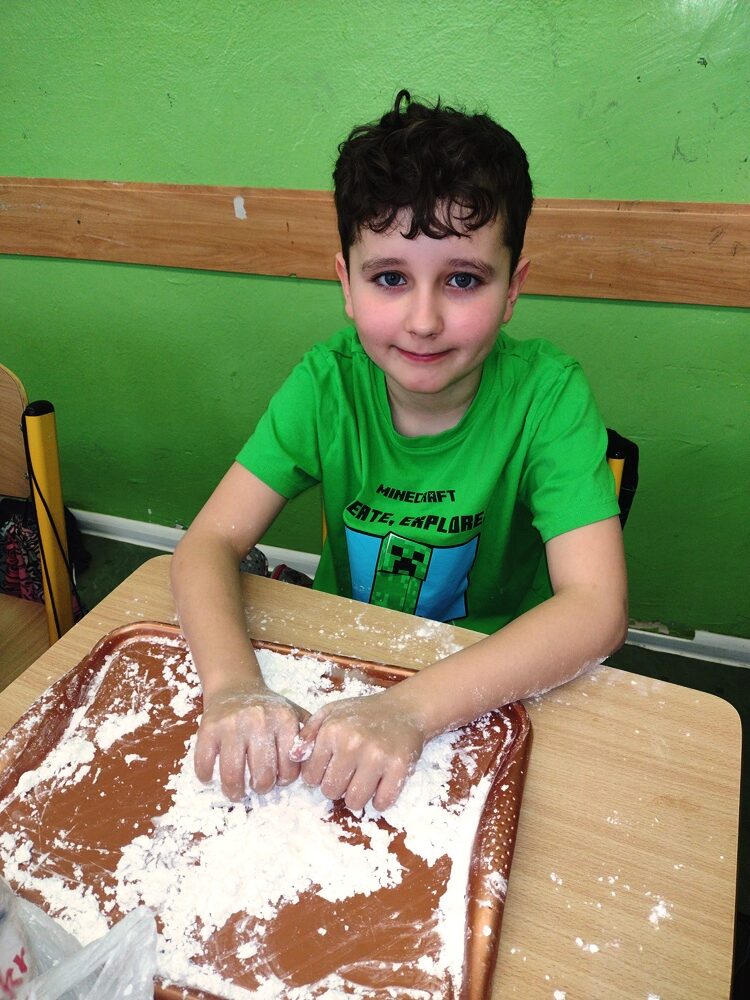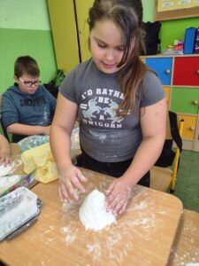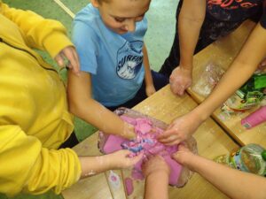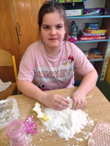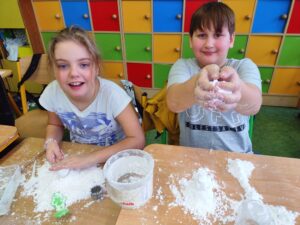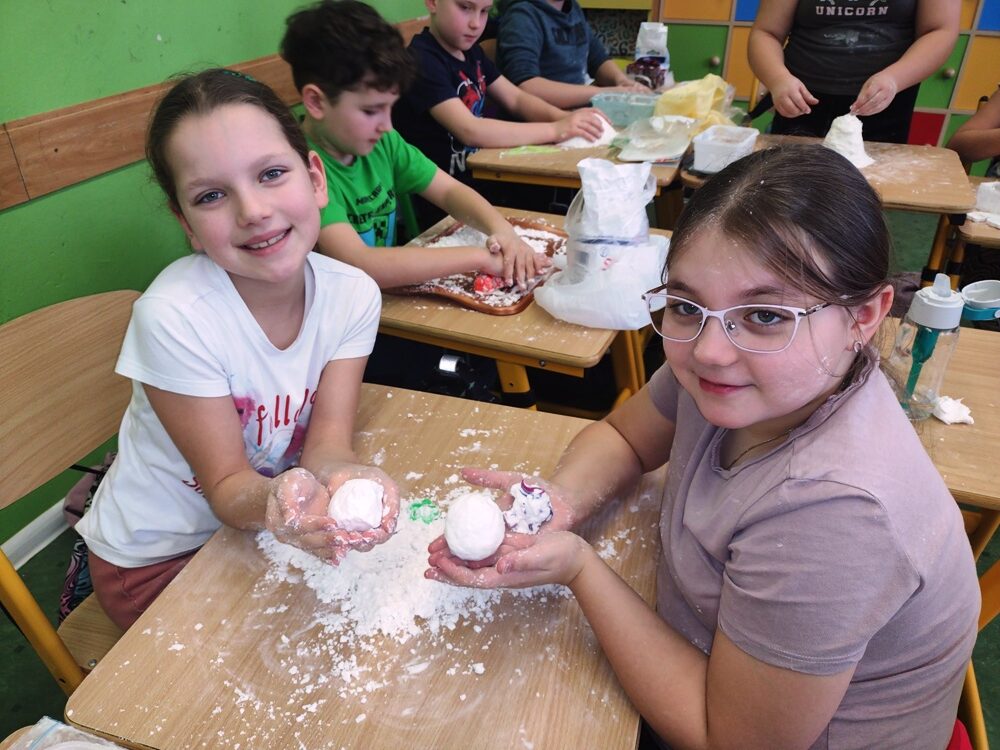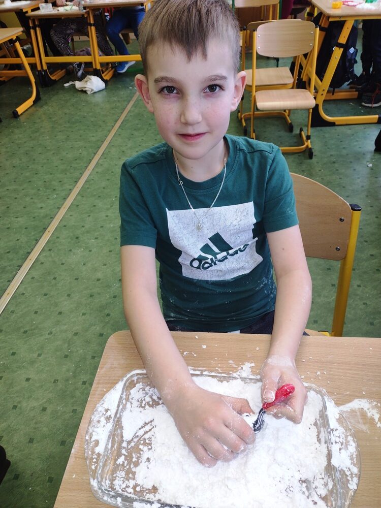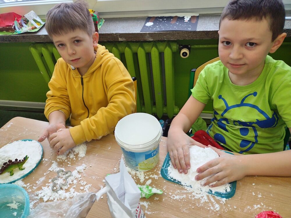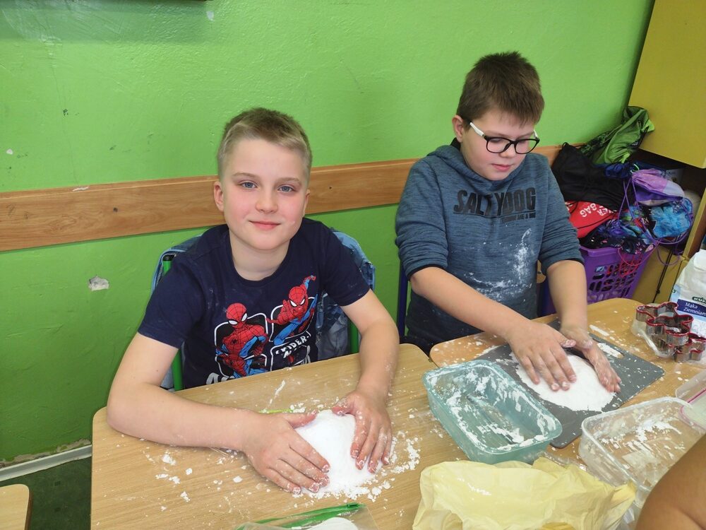 Uczniowie klasy 3a w ramach zajęć z edukacji plastycznej mieli okazję stworzyć sensoryczne masy plastyczne, takie jak „ciepły śnieg”, „piankolina’, a także sprawdzić właściwości „cieczy nieniutonowskiej” oraz hydrożelu, który po dodaniu do niego wody wyglądem przypomina mokry śnieg. W tym celu na lekcji wykorzystano takie składniki, jak mąka ziemniaczana, olej, barwniki spożywcze, pianka do golenia oraz hydrożel ogrodniczy. Tematem przewodnim zajęć była obecna „zima”, a ciepły śnieg pozwolił na zbudowanie śniegowych kul czy budowli, a także innych płaskich i przestrzennych form. Uczniowie wykazali się dużą kreatywnością, a samo przygotowywanie własnych mas plastycznych przyniosło im dużo radości oraz spontanicznej dziecięcej zabawy. W trakcie aktywności najmłodszych z masami plastycznymi zostały zangażowane ich zmysły – wzrok, dotyk, węch, słuch, co sprzyja lepszemu poznaniu otaczającego nas świata oraz zachodzących w nim zjawisk, a tym samym wpływa na prawidłowy rozwój dzieci. Zachęcamy inne klasy do warsztatów i zabaw twórczych z masami plastycznymi.