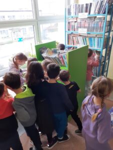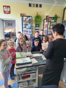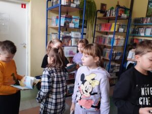 Pierwszoklasiści z wielkim zainteresowaniem przyglądali się książkom znajdującym się na półkach. Szczególnie podobały im się te kolorowe, bogato ilustrowane. Pani bibliotekarka opowiedziała o bibliotece i jej zbiorach. Dzieci zobaczyły, jak wygląda karta czytelnika oraz poznały zasady wypożyczania książek. Dowiedziały się także, jak należy zachować się w bibliotece i dbać o książki. Po wysłuchaniu „próśb książki” nasi najmłodsi uczniowie musieli wykazać się znajomością baśni i bajek, odgadując specjalnie przygotowane zagadki, z czym poradzili sobie znakomicie.