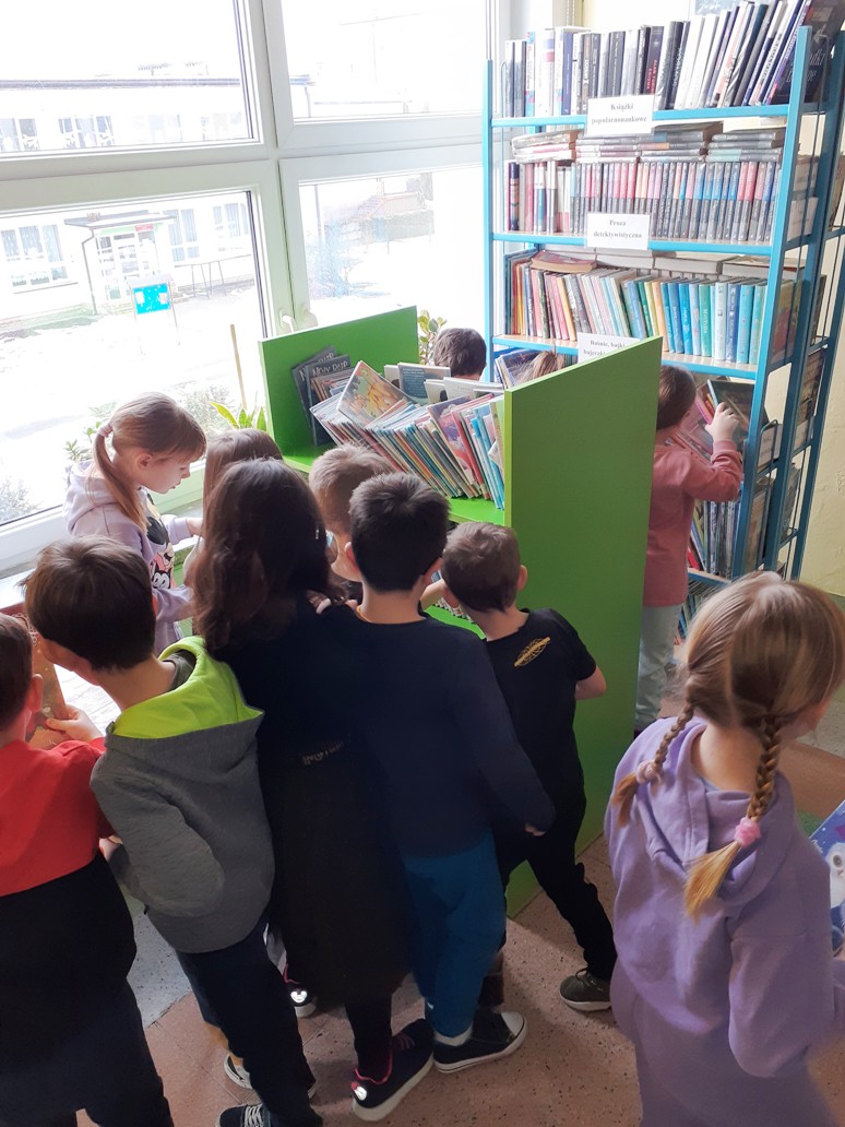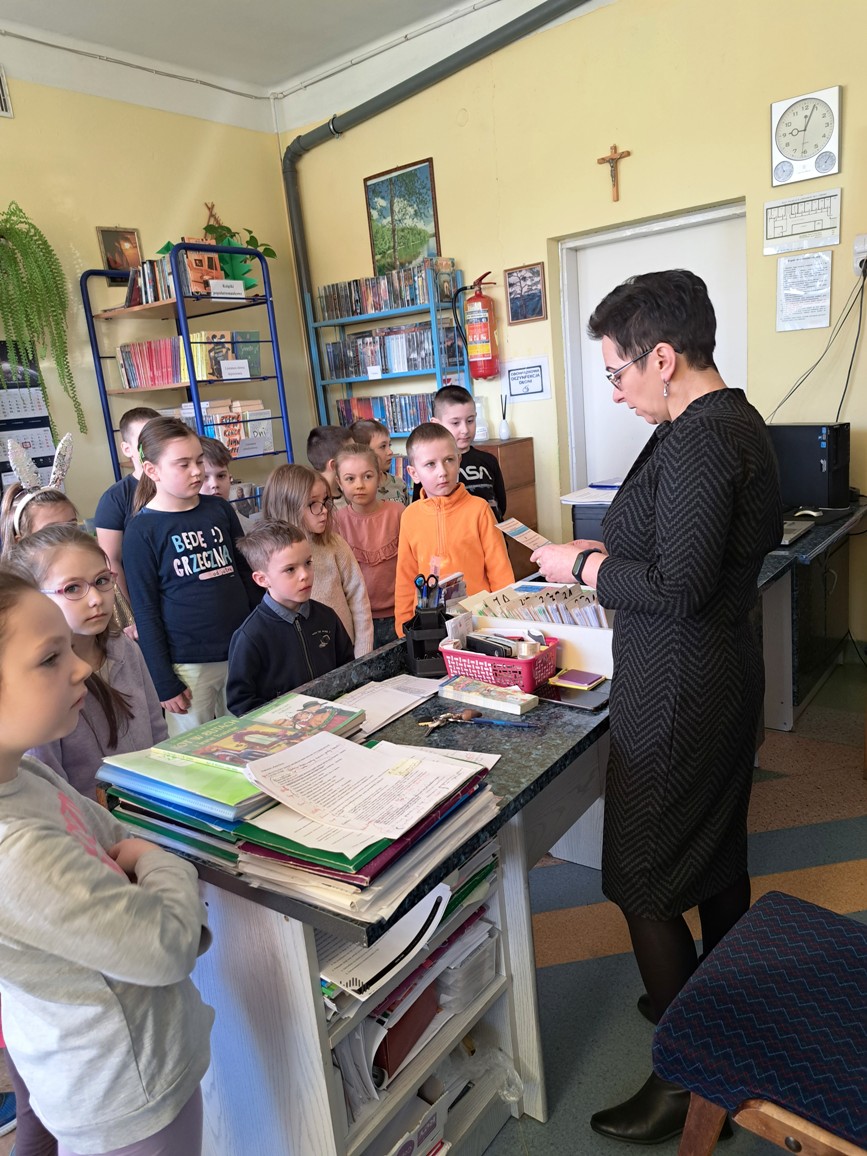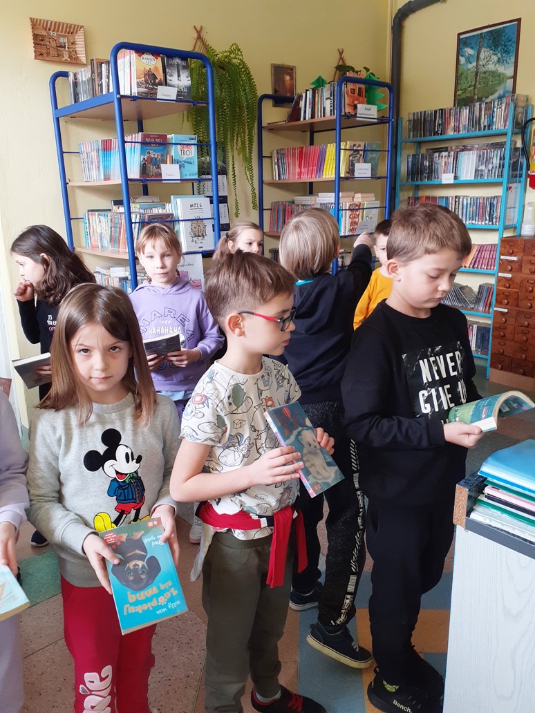 Pierwszoklasiści z wielkim zainteresowaniem przyglądali się książkom znajdującym się na półkach. Szczególnie podobały im się te kolorowe, bogato ilustrowane. Pani bibliotekarka opowiedziała o bibliotece i jej zbiorach. Dzieci zobaczyły, jak wygląda karta czytelnika oraz poznały zasady wypożyczania książek. Dowiedziały się także, jak należy zachować się w bibliotece i dbać o książki. Po wysłuchaniu „próśb książki” nasi najmłodsi uczniowie musieli wykazać się znajomością baśni i bajek, odgadując specjalnie przygotowane zagadki, z czym poradzili sobie znakomicie.