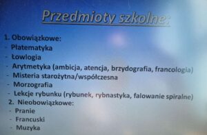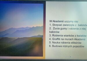 Tym razem mogli wykonać prezentację multimedialną, plakat lub szczegółowy opis na temat szkoły, jaka nie istnieje w realnym świecie ( inspiracją była szkołę Żółwiciela). Uczniowie użyli swojej wyobraźni (a ta naprawdę nie ma granic 🙂 i projektowali miejsce, w jakim znajduje się szkoła,opisywali wygląd budynku szkolnego, wymyślali przedmioty, których można się uczyć w tej szkole, określali, jacy uczniowie do niej chodzą oraz jacy nauczyciele w niej uczą.