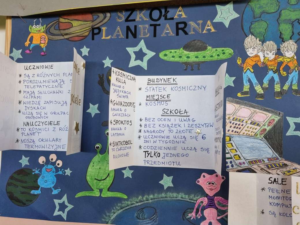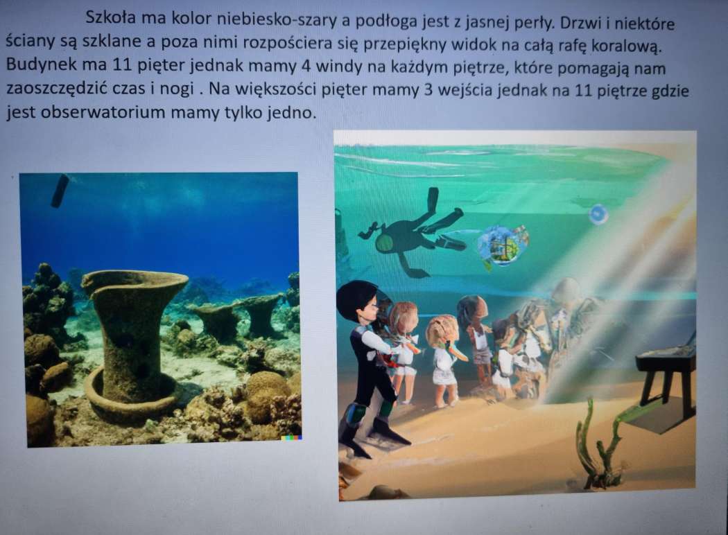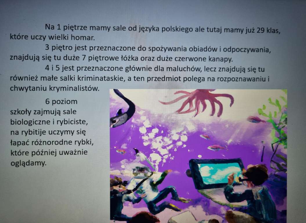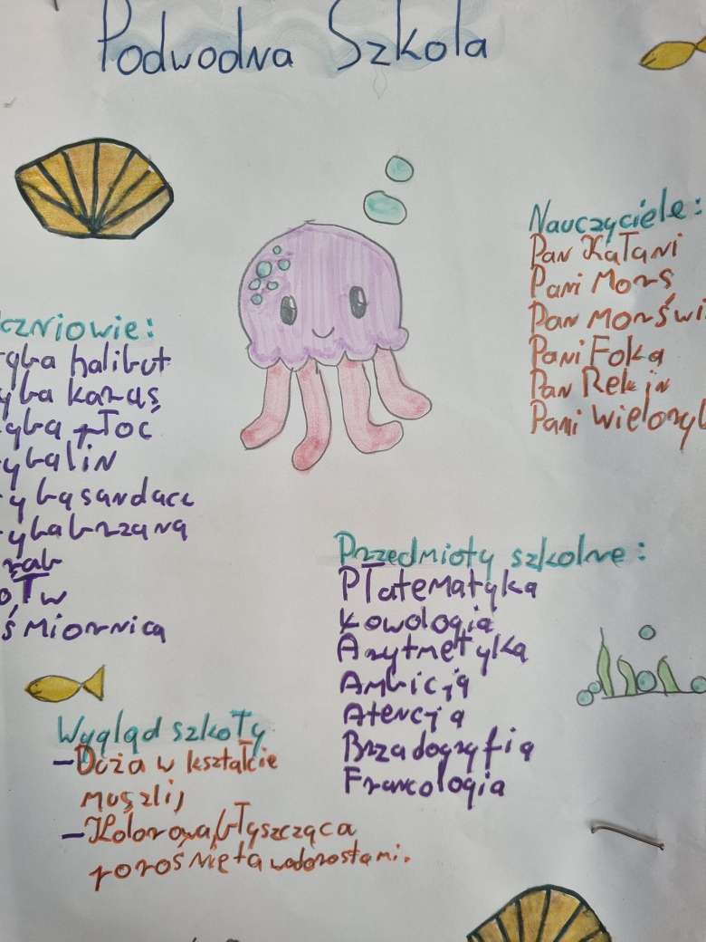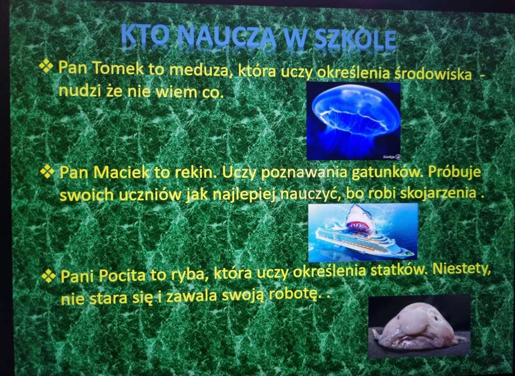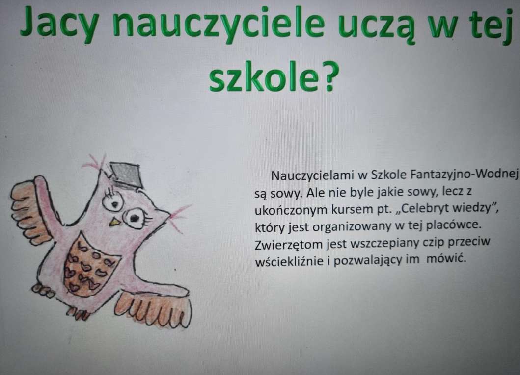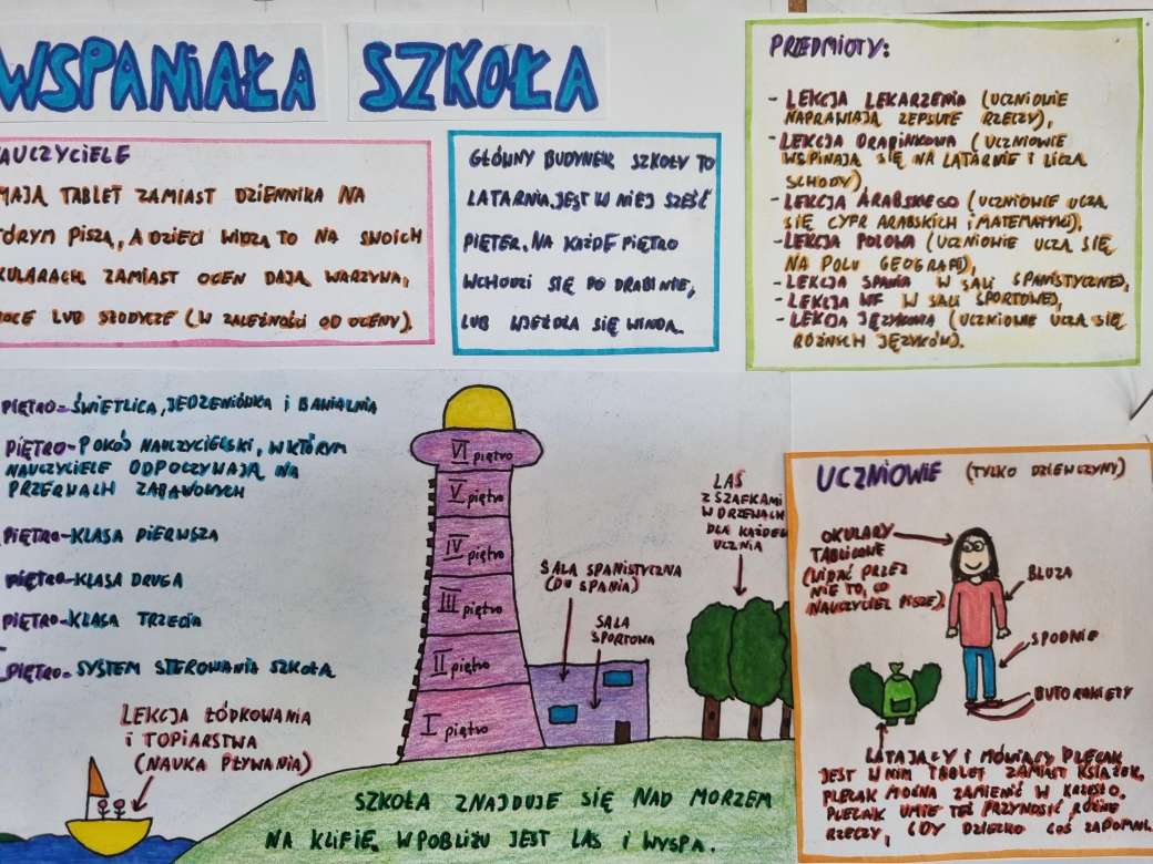 Tym razem mogli wykonać prezentację multimedialną, plakat lub szczegółowy opis na temat szkoły, jaka nie istnieje w realnym świecie ( inspiracją była szkołę Żółwiciela). Uczniowie użyli swojej wyobraźni (a ta naprawdę nie ma granic 🙂 i projektowali miejsce, w jakim znajduje się szkoła,opisywali wygląd budynku szkolnego, wymyślali przedmioty, których można się uczyć w tej szkole, określali, jacy uczniowie do niej chodzą oraz jacy nauczyciele w niej uczą.