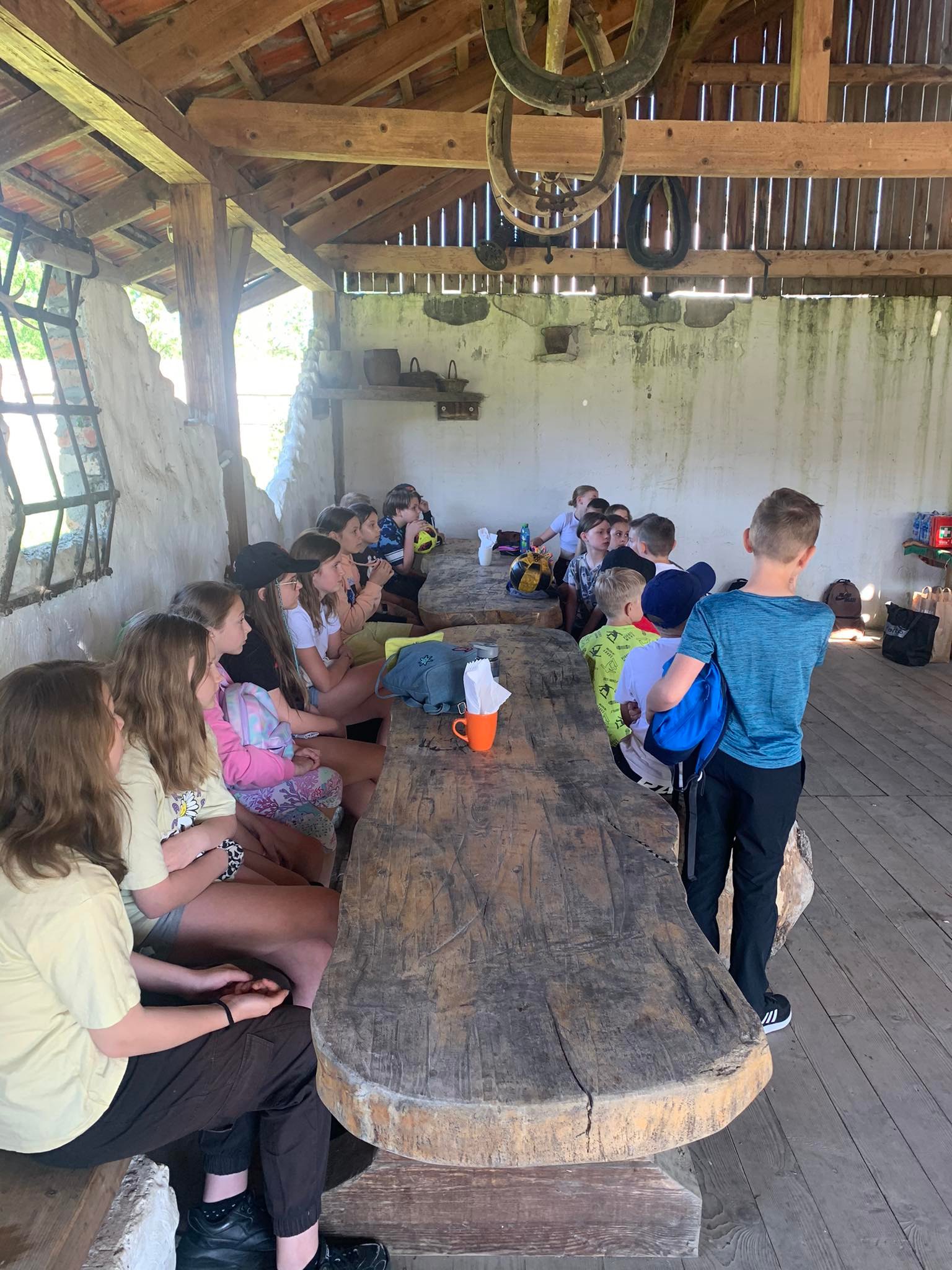 Atrakcje wieńczył wspólny poczęstunek pod wiatą, gdzie fantastyczni gospodarze zadbali o przygotowanie dla całej grupy kiełbasek i bananów w czekoladzie z grilla. Na koniec Pani Julia nauczyła nas tańca kowbojskiego, który kończył przygodę w tym urokliwym miejscu.